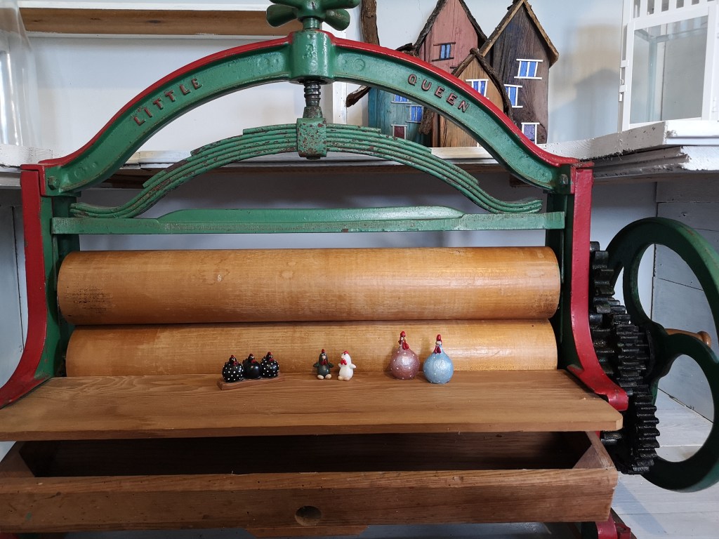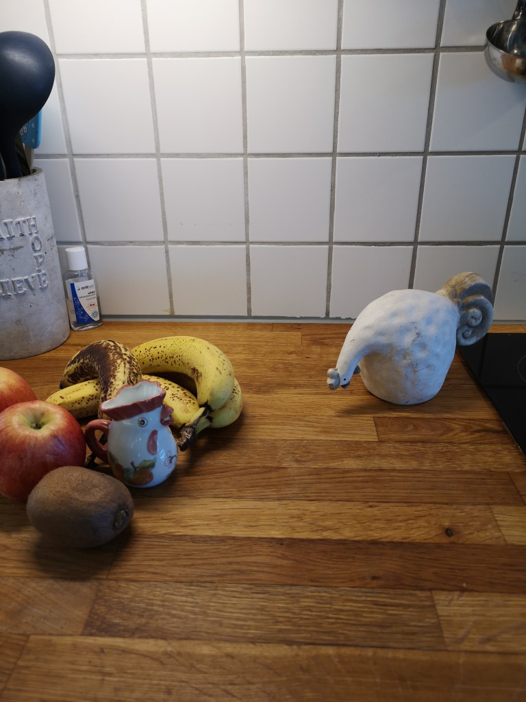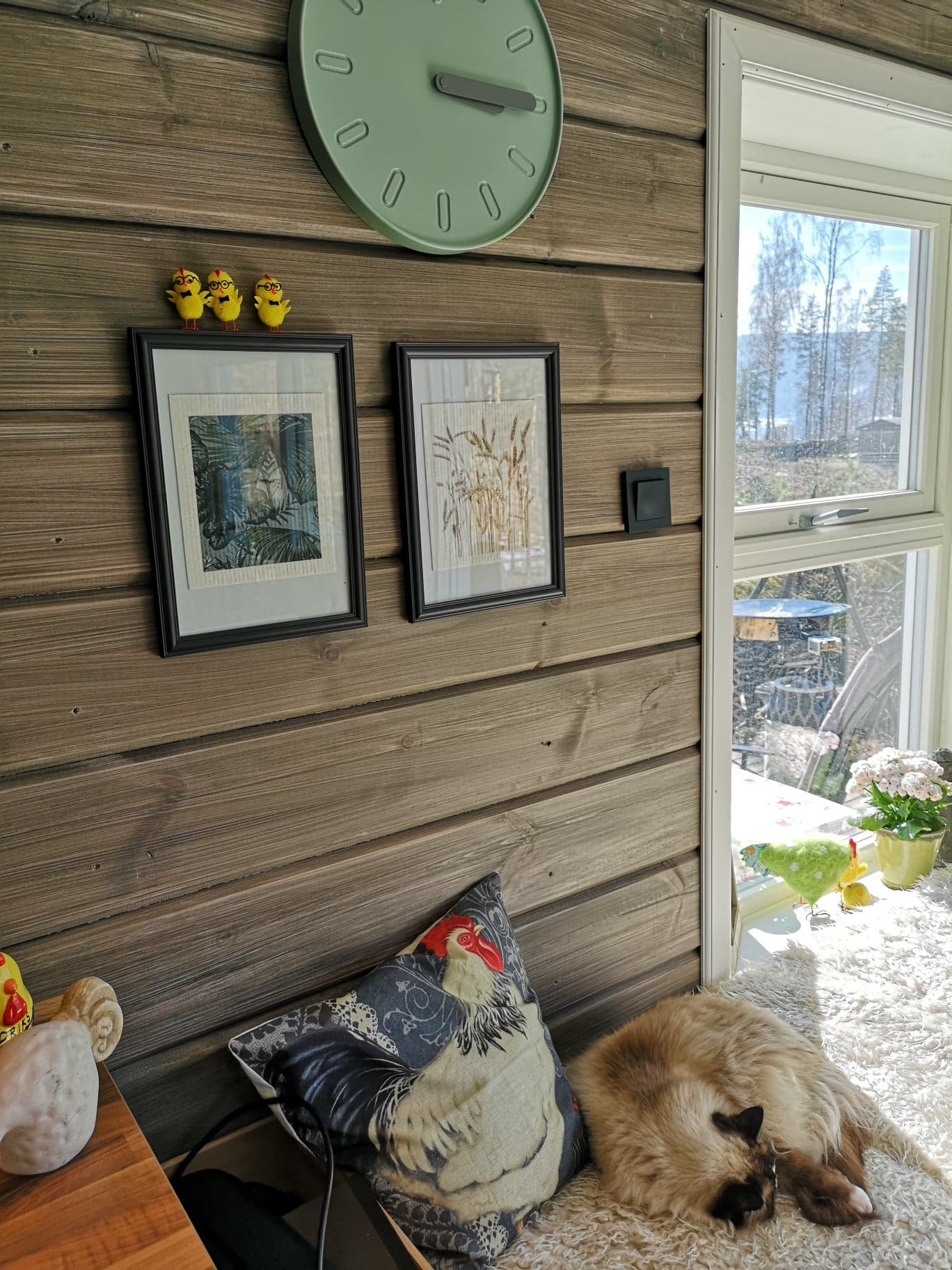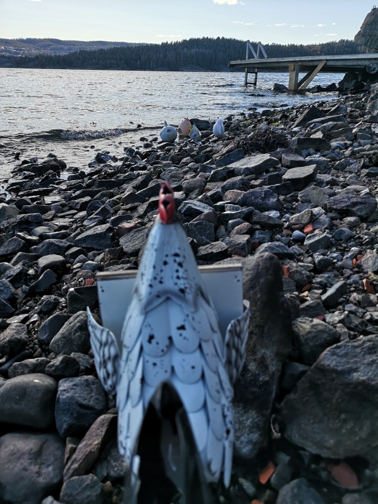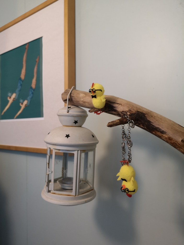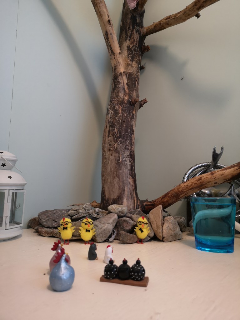 Vel inne på badet måtte de kave litt for å komme seg opp på ei treplate ved siden av vasken. «Og her kan dere få kikke på litt brukskunst, her har matmor tatt inn et tre hvor folk kan henge håndklærne sine» – Brille slo stolt ut med vingen mot treet, han likte dette treet veldig godt. «Kjære vene», – hvisket SpotOn, «har hun kanskje litt dårlig råd denne matmoren vår?» Hun kikket spørrende på søstrene sine. PrikkAra nikket seg enig, mens SvarteKlara ristet ergelig på hodet – «pysj, dere altså, jeg synes det er kjempefint, hun er sikkert bare litt leken, ikke vær så dømmende nå,»