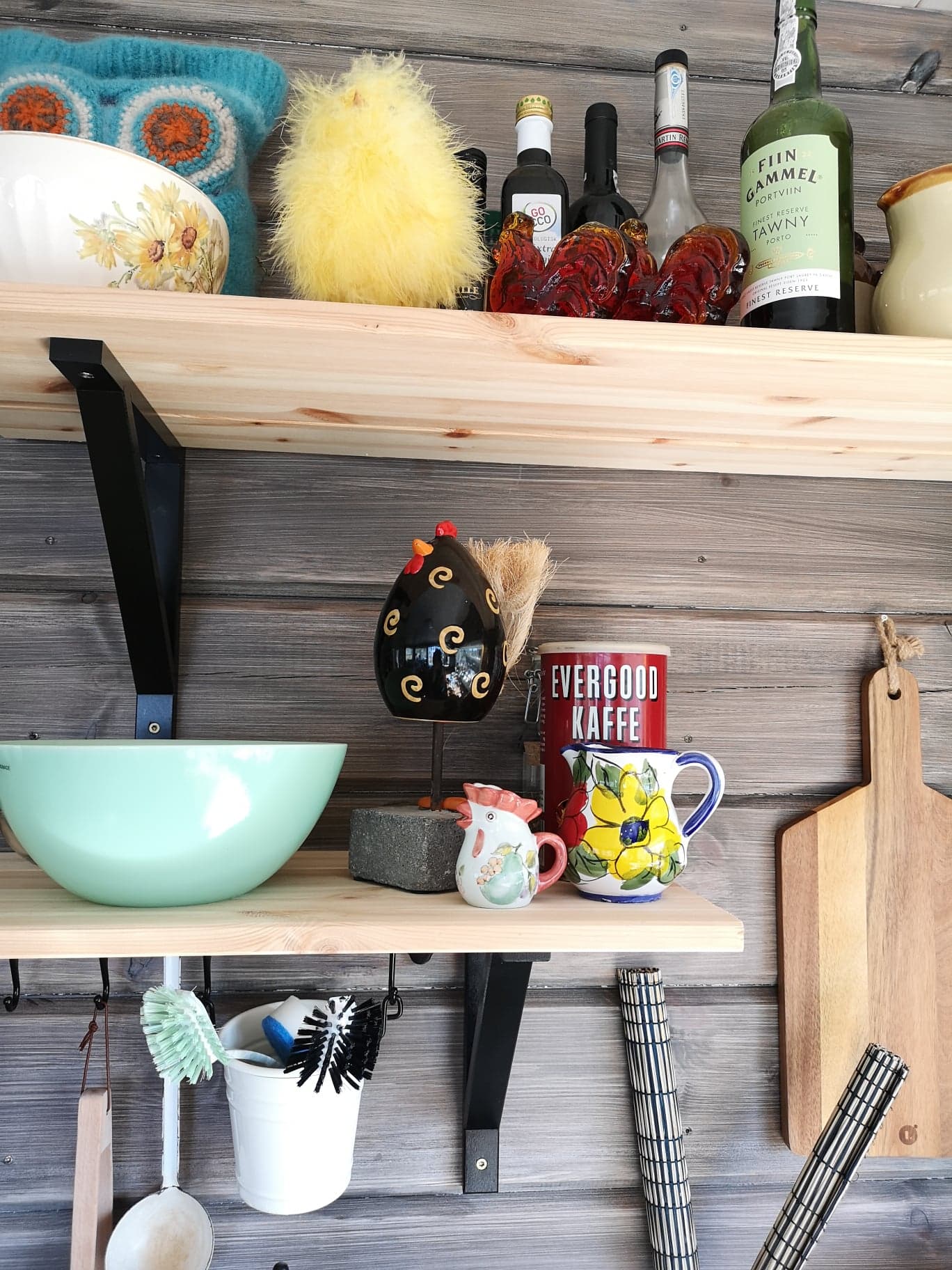 Så var turen nesten over og flokken begynte på den tunge turen opp kjellertrappen igjen. Alle var slitne nå, men Trillingbrødrene hadde lovet å vise frem skapdørene på kjøkkenet. «Turtelduene Den lille hvite Høna og SvarteLars flakset seg helt opp i skapkarmen, mens resten av gjengen ble stående igjen på gulvet. «Her ser dere nok et utslag av matmors brukskunst, en makrellstim sirlig klippet ut av servietter og limt fast på skapdøren. Etterpå ble alt lakket fast.» – Granske gjespet forsiktig nå. «Takk for i dag, håper dere har hatt en fin opplevelse. Dere finner veien hjem selv nå, bare gå igjennom kjøkkendøra der så står skjenken rett frem.»
