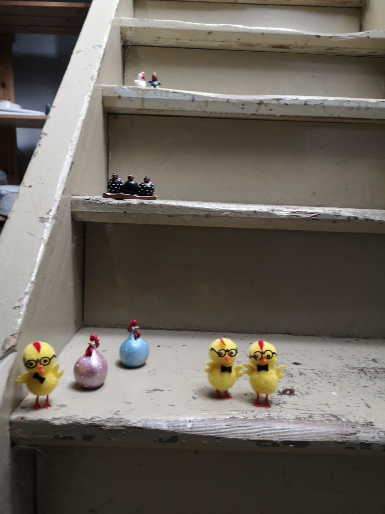 «Kom igjen folkens, følg etter meg, vi skal denne veien» – Granske ropte og vinket for å få Mikrohønseklubben «BitteLiten»til å gå litt fortere ned kjellertrappa. «Dette kommer til å bli en lang dag» – sa Brille til Telle. De sto å kikket på de bittesmå hønsene som trippet ned trappa. «Hysj, – sa Telle, «de kan høre deg. Dette måtte vi jo regnet med» – hvisket han. «Se på de bittesmå beina, ikke rart dette tar tid.» Trillingbrødrene hadde tatt på seg en ekstrajobb utenom studiene sine i dag. Mikroklubben hadde så veldig lyst på en liten påskeutflukt så trillingene hadde foreslått en tur til kjelleren for å se på litt lokal kunst. Mikroklubben hadde slått til med en gang og nå var de i gang med nedstigningen.