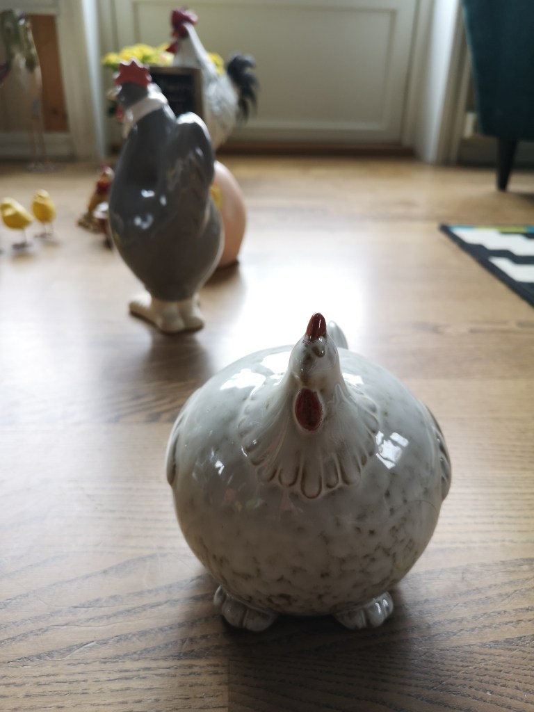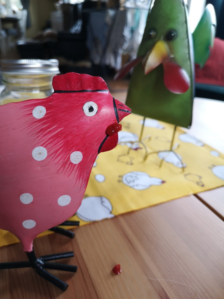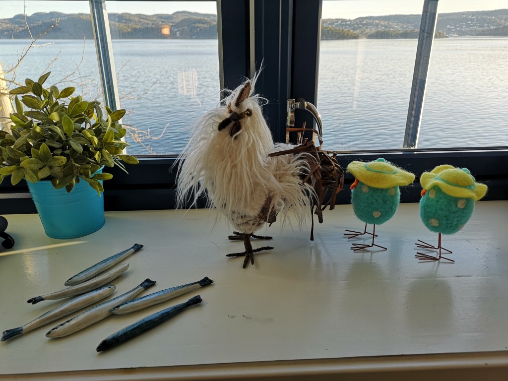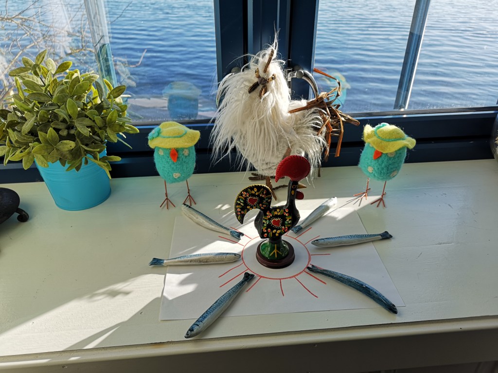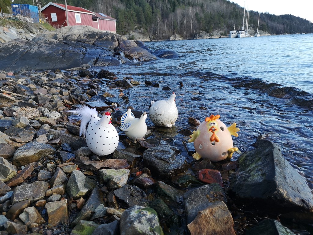 «Wow, ganske imponerende utsikt herfra» – den lille blå hanen kikket ut kjellervinduet og så havet rett utenfor. «Joda,» – svarte den lille rosa hanen «men det er veldig langt ned», – hanen grøsset litt, «dessuten har jeg aldri stått på vannski før.» «Bak oss her, ser dere det flotte akvariemaleriet, malt av husstandens yngste datter.» – Granske pekte stolt på maleriet og hele den lille hønseflokken nikket beundrende.
